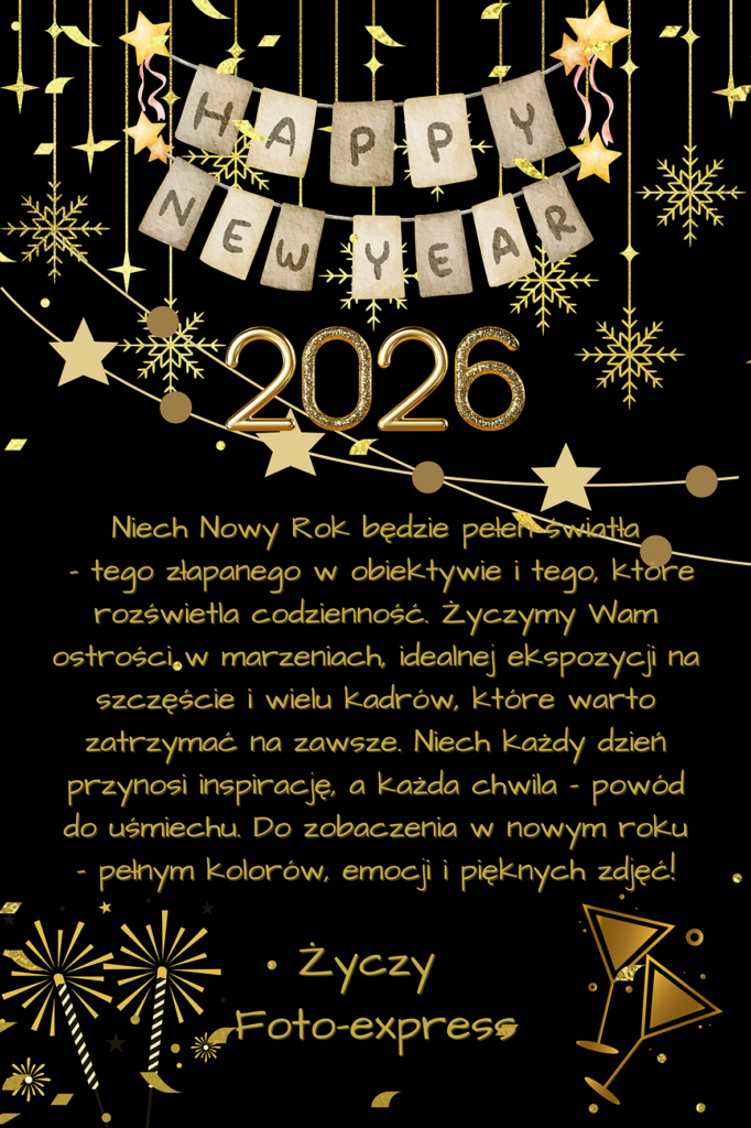 Niech Nowy Rok będzie pełen światła – tego złapanego w obiektywie i tego, które rozświetla codzienność. Życzymy Wam ostrości w marzeniach, idealnej ekspozycji na szczęście i wielu kadrów, które warto zatrzymać na zawsze. Niech każdy dzień przynosi inspirację, a każda chwila – powód do uśmiechu. Do zobaczenia w nowym roku – pełnym kolorów, emocji i pięknych zdjęć! Życzy Foto-express